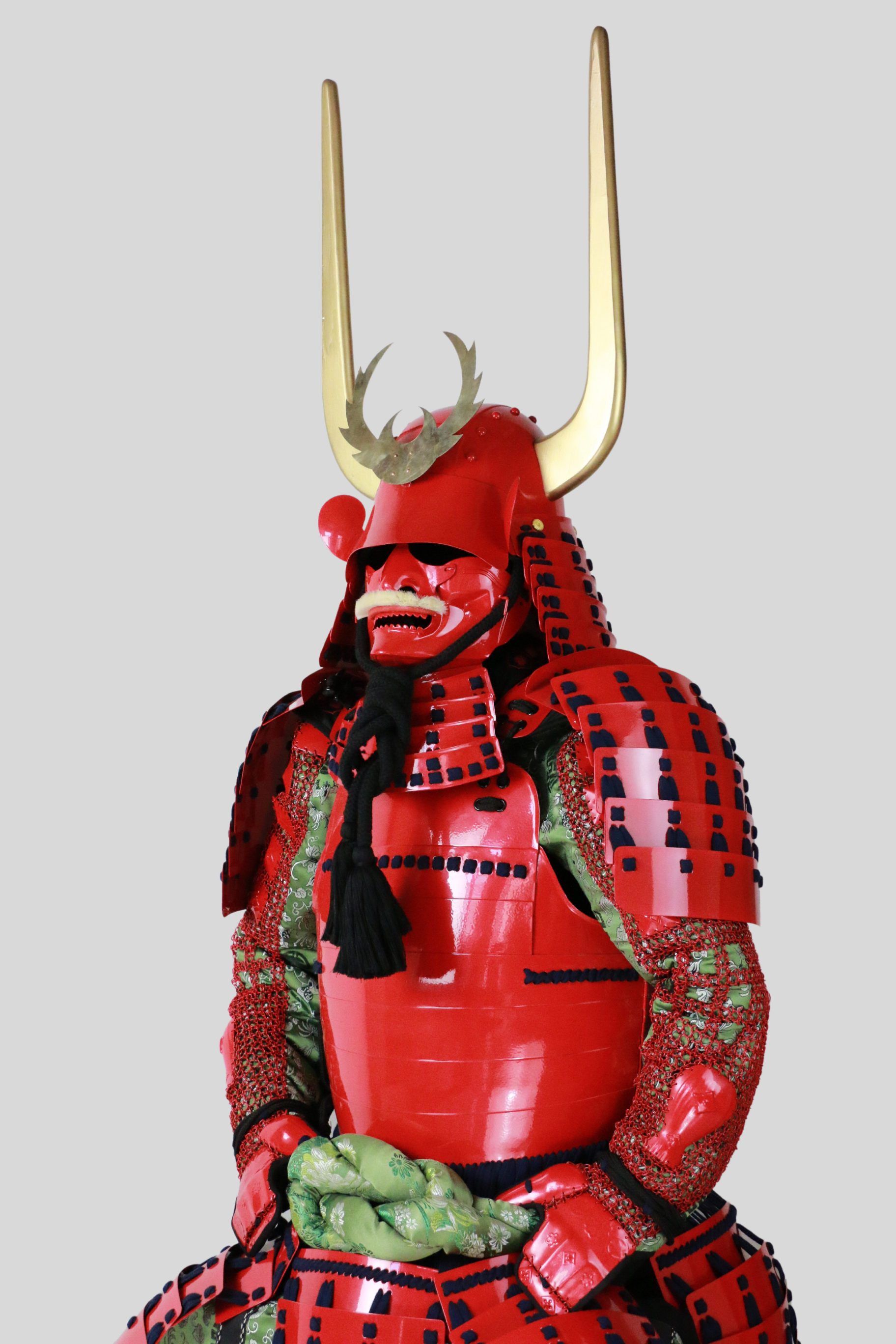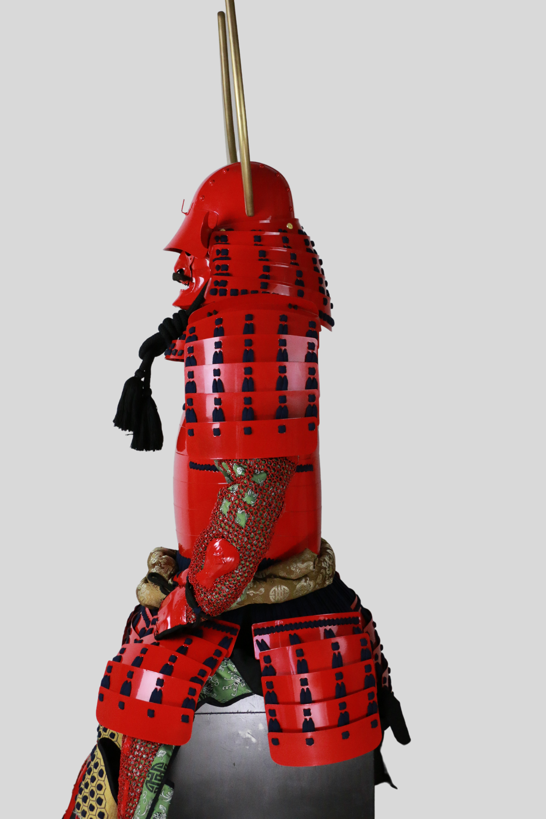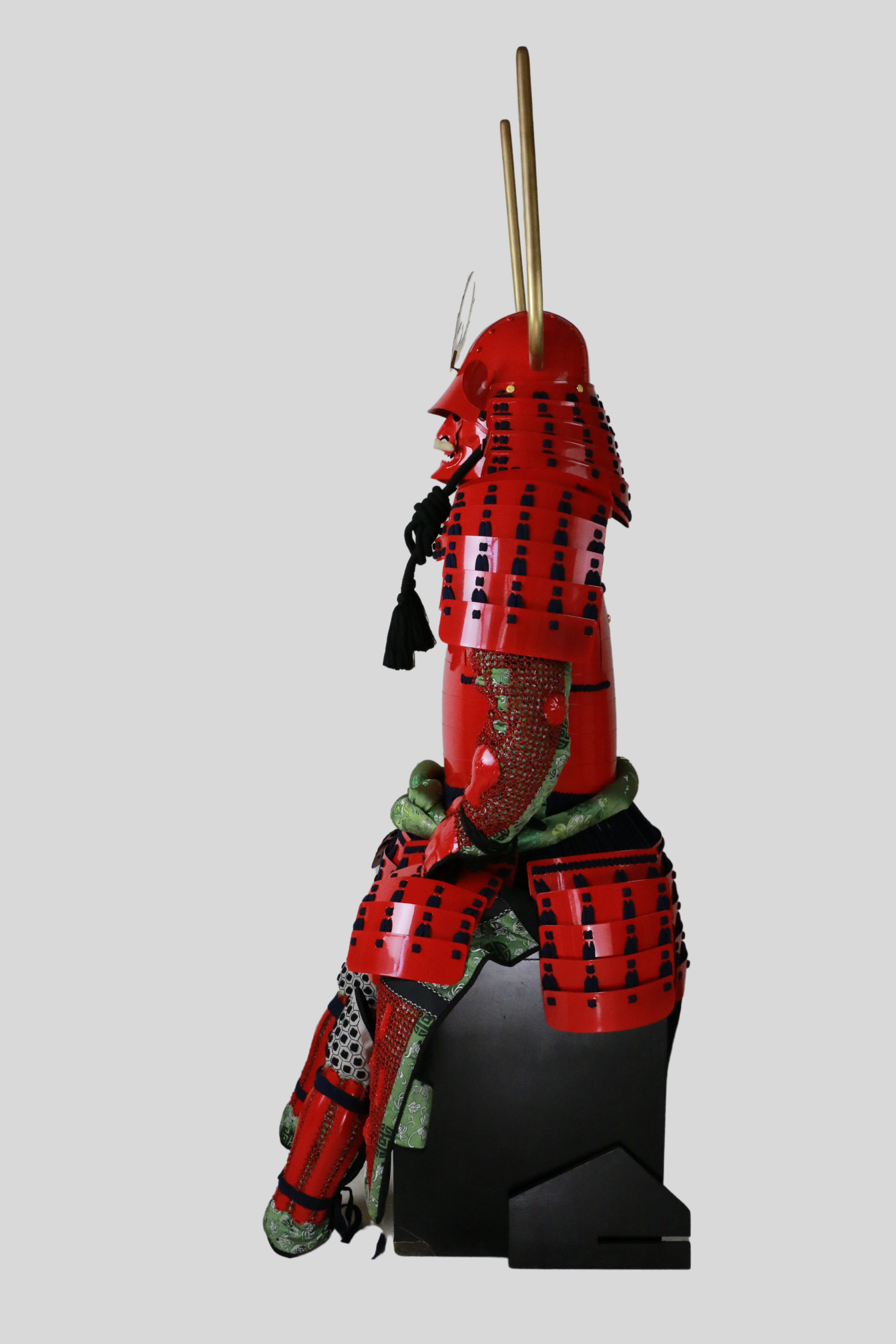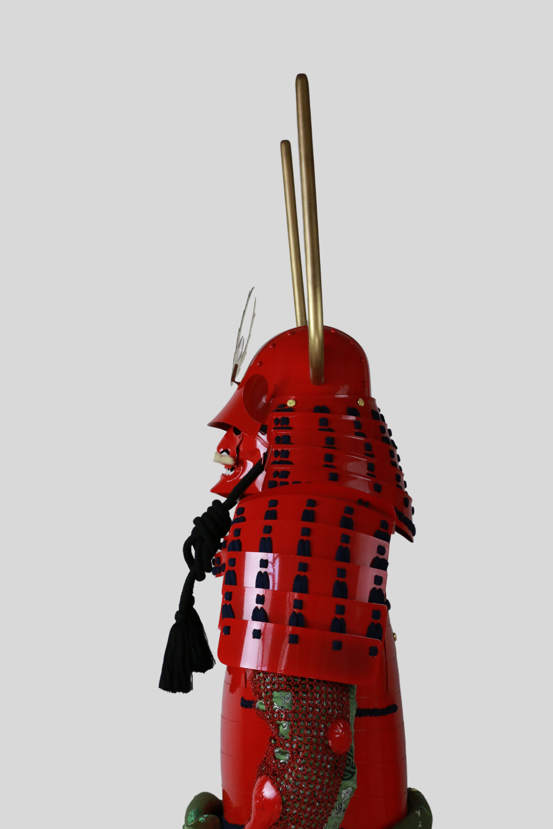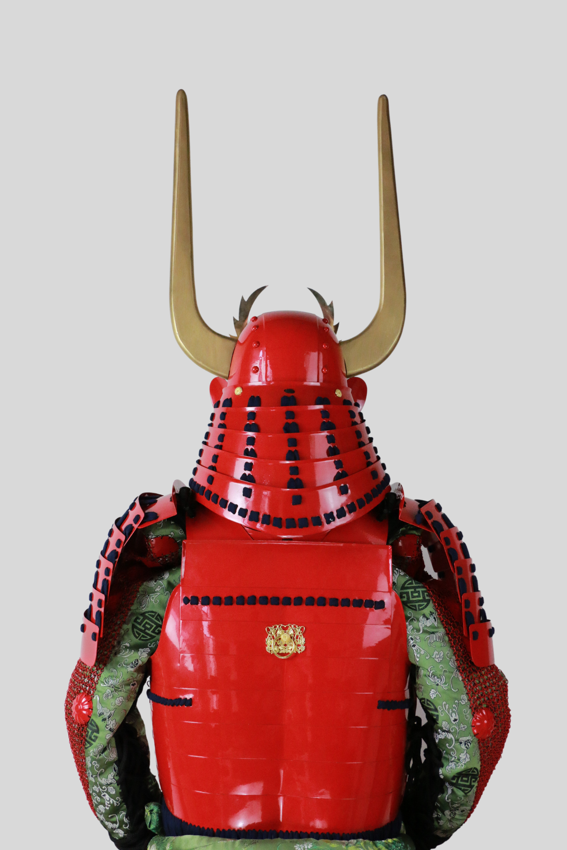 Les troupes de Naomasa, vêtues d'armures d'un rouge éclatant, étaient surnommées les « Diables Rouges » du champ de bataille. Son apparence intimidante lui valut le surnom redoutable d' Akaoni – l'Ogre Rouge . La palette de couleurs flamboyantes, inspirée des Takeda, était conçue pour semer la terreur chez les ennemis avant même que les épées ne soient dégainées. Les imposantes cornes dorées du kabuto symbolisent la puissance et la domination, complétant la présence du guerrier, impossible à ignorer.