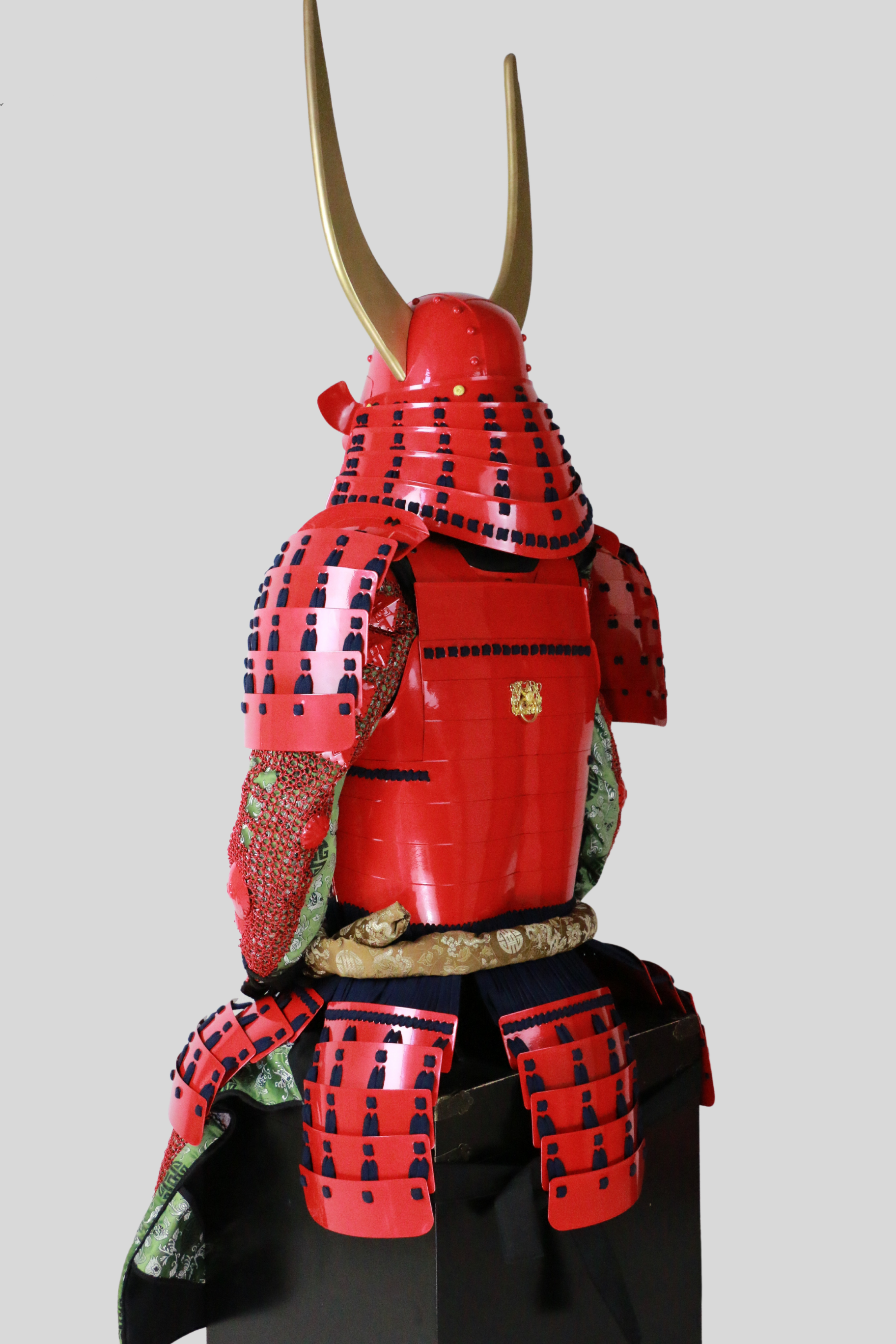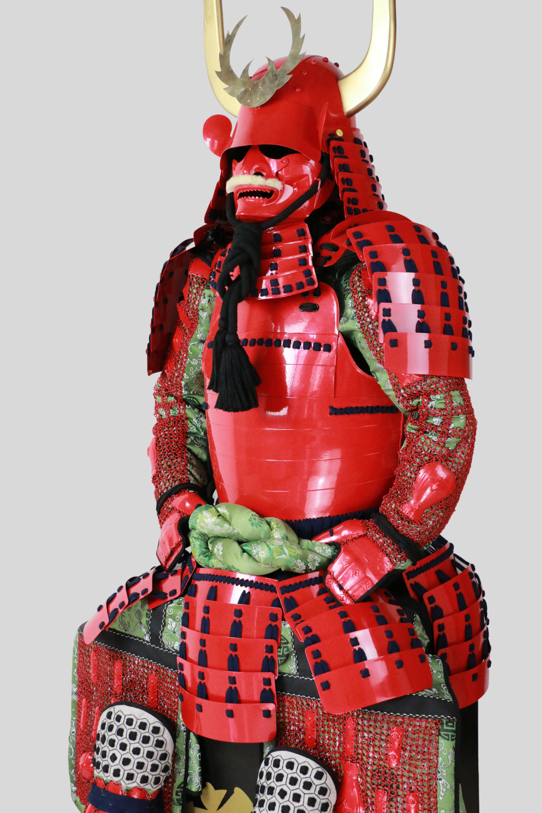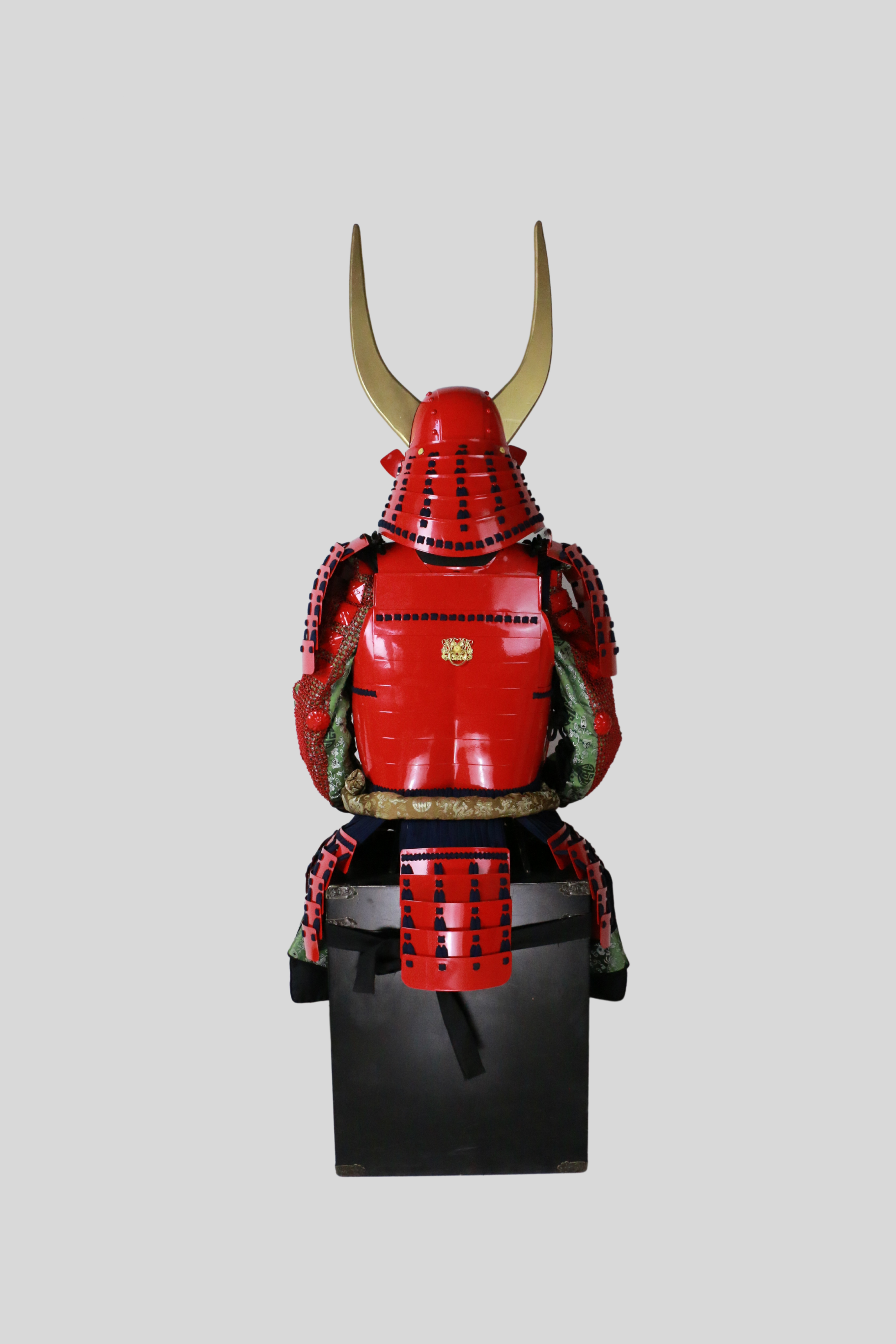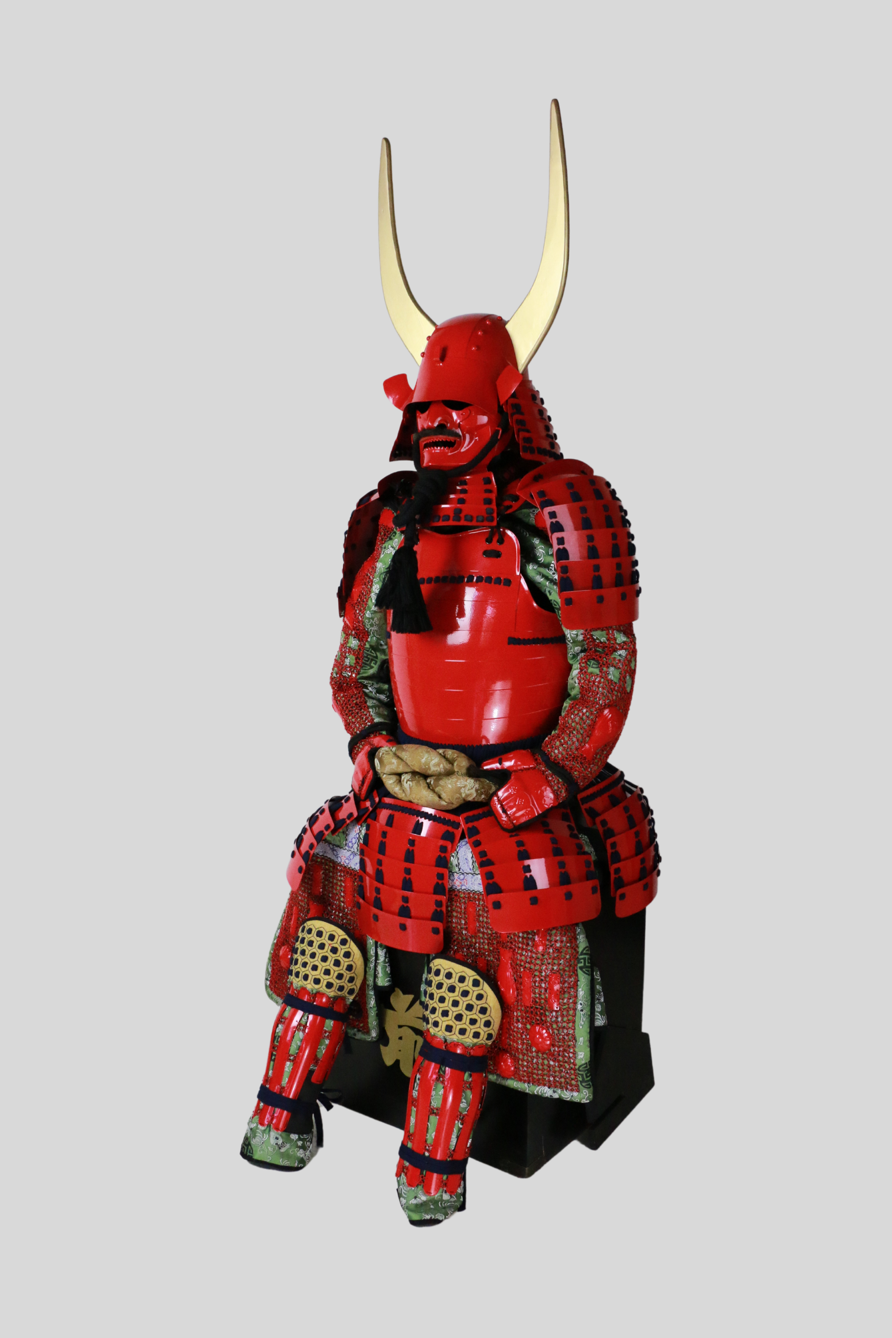 Les troupes de Naomasa, vêtues d'armures d'un rouge éclatant, étaient surnommées les « Diables Rouges » du champ de bataille. Son apparence intimidante lui valut le surnom redoutable d' Akaoni – l'Ogre Rouge . La palette de couleurs flamboyantes, inspirée des Takeda, était conçue pour semer la terreur chez les ennemis avant même que les épées ne soient dégainées. Les imposantes cornes dorées du kabuto symbolisent la puissance et la domination, complétant la présence du guerrier, impossible à ignorer.